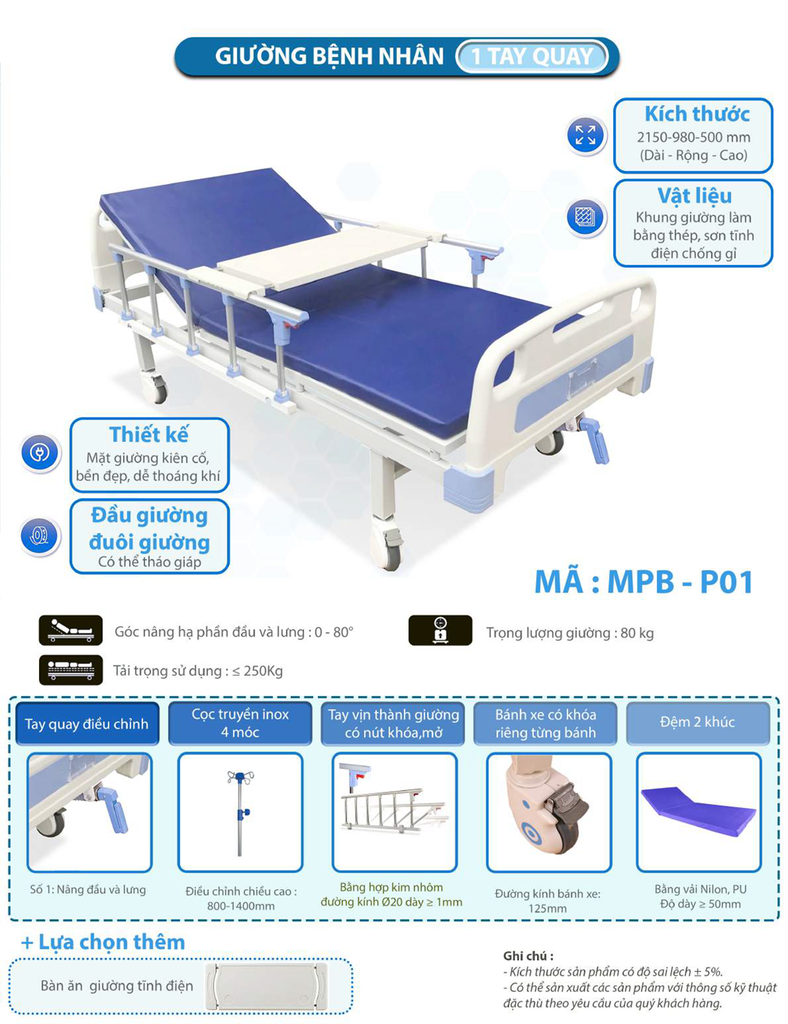 Giới thiệu giường bệnh nhân, giường y tế 01 tay quay: