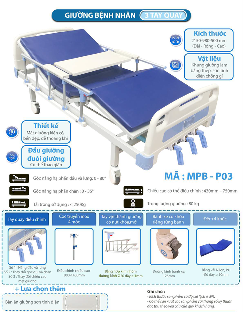 Giới thiệu giường bệnh nhân, giường y tế 03 tay quay: